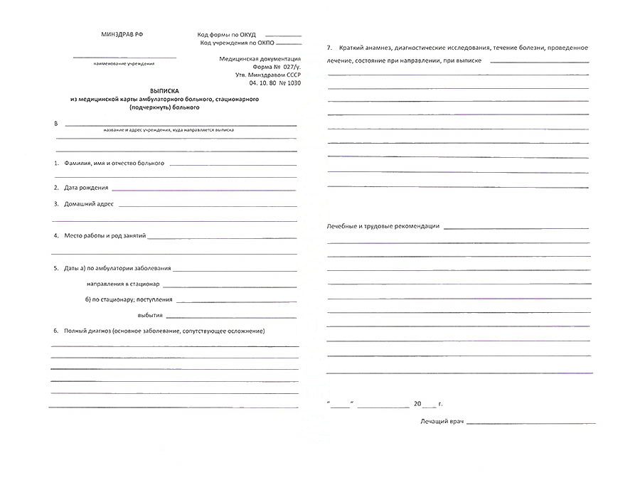 Стационарная форма 027/у – это выписка из карты больного находившегося в стационаре любого лечебного учреждения, содержит данные осмотров и диагностических обследований, анамнез, результаты лабораторных исследований, информацию о динамике развития болезни и рекомендации по дальнейшему лечению и профилактике.