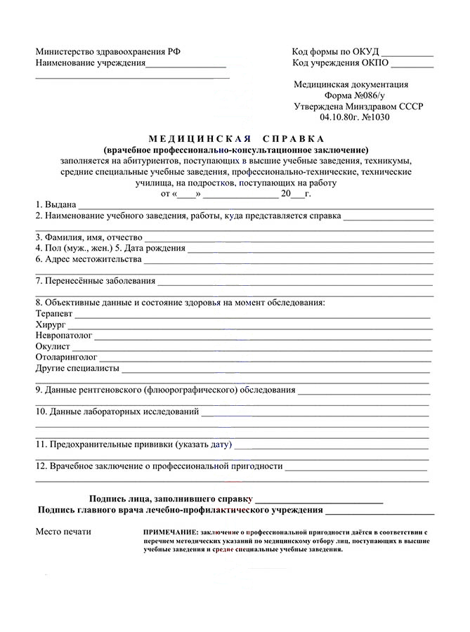 Справка форма 086/у представляет из себя заключение медицинской врачебной комиссии о пригодности человека к поступлению в учебное заведение или трудоустройству по определенной специальности.