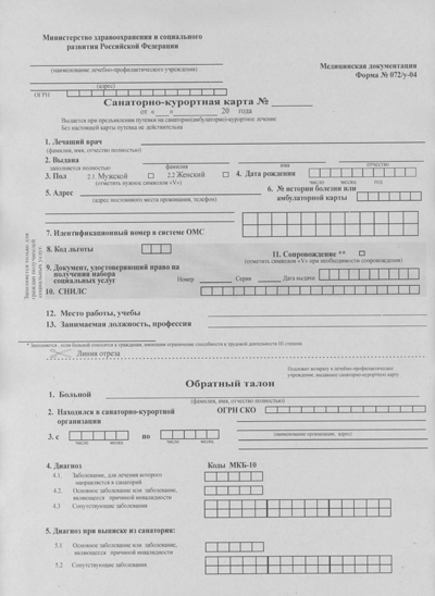 Медицинская справка 072/у (санаторно-курортная карта) – это документ, который оформляют на каждого человека, направляющегося в санаторий любого профиля. Без санаторно-курортной карты пройти курс лечения в санатории невозможно.