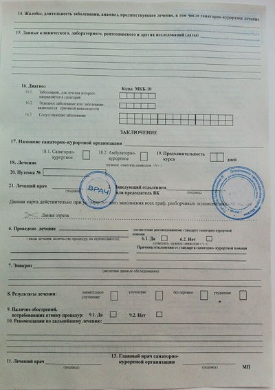 Лечащий врач заполняет только основную часть, в которой указывается вся личная информация о пациенте, диагнозы заболеваний и рекомендации по лечению. Также в карте указываются результаты медицинского обследования, которое проводится перед направлением в санаторий. В частности в справке отражаются результаты, электрокардиограммы, анализов мочи и крови.