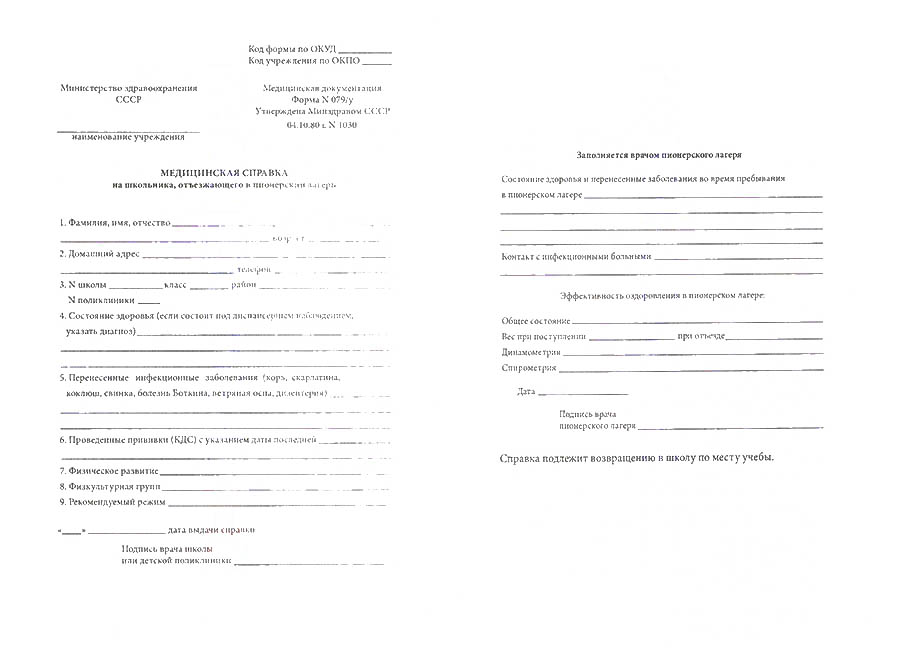 Справка для детского лагеря форма 079/у будет необходима для отправки ребенка в летний лагерь на отдых, оформляется она по результатам обследования врачом поликлиники, результатам анализов и данных из амбулаторной карты ребенка.